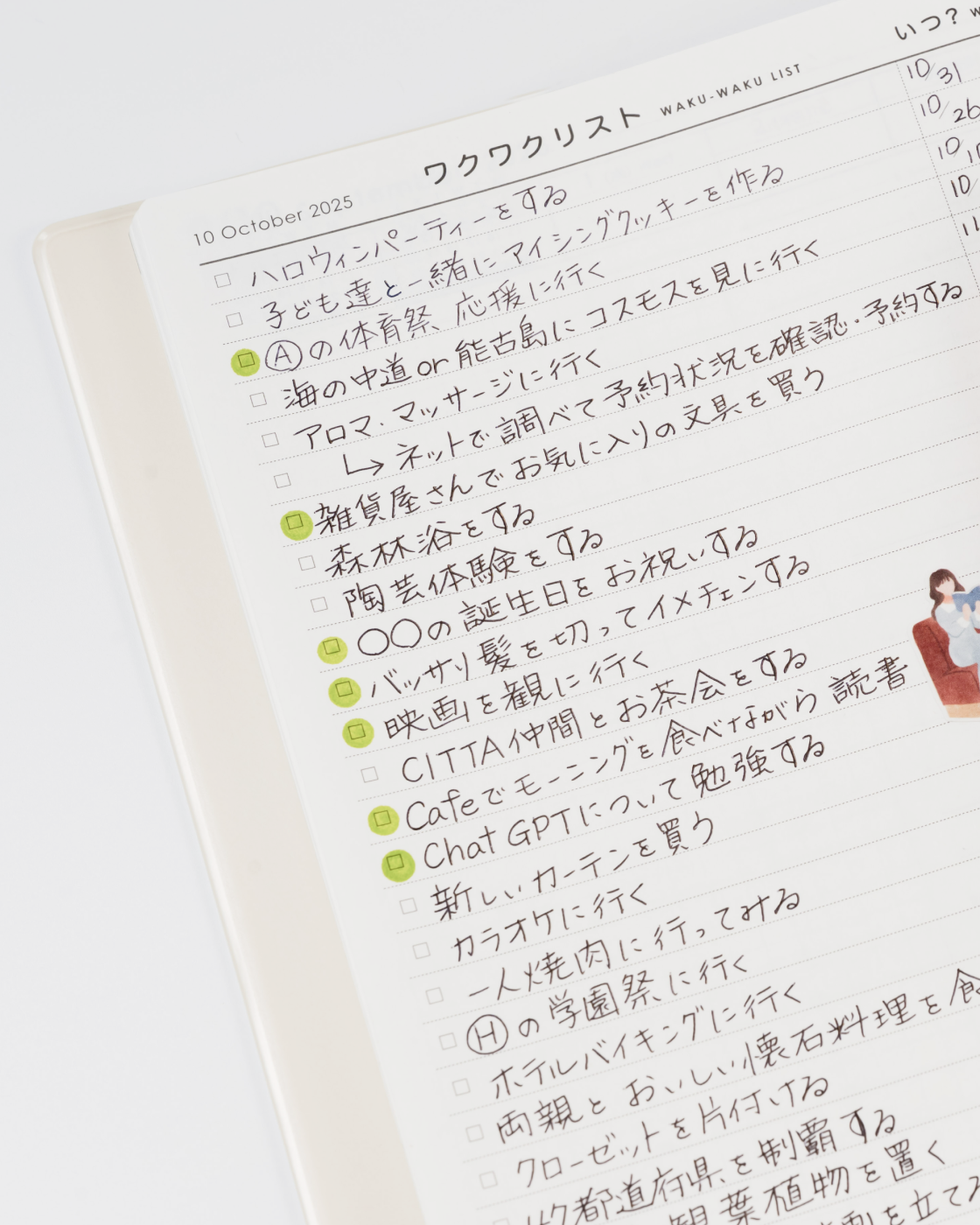 ワクワクリストが、すべての原動力! まずは「やりたい!」と思うことをすべて書き出しましょう。 プライベートも仕事も家庭のことも、大小・期間を問わずなんでもOK。