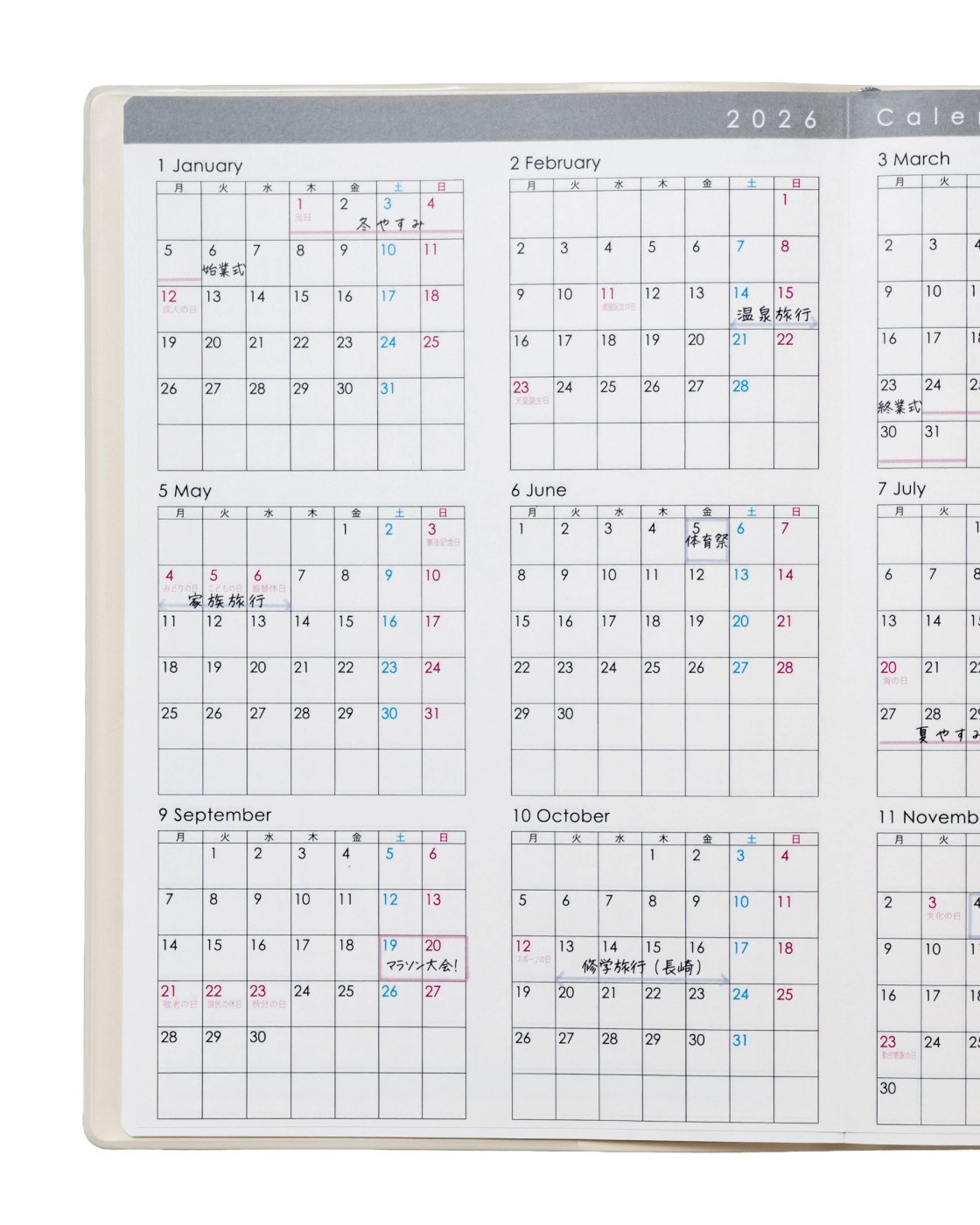 ハッキリした白色にゴールドの印字がオシャレです。大人っぽく、エレガントな雰囲気を味わえるカラー。真っ白い手帳にあなた色の未来を描き込んでください。