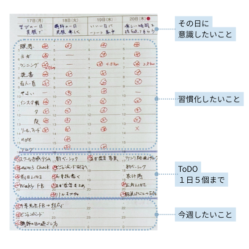 習慣化したいものを上の段、ToDo(1日5つまで)を真ん中、他に今週したいことを下の段に書いています。