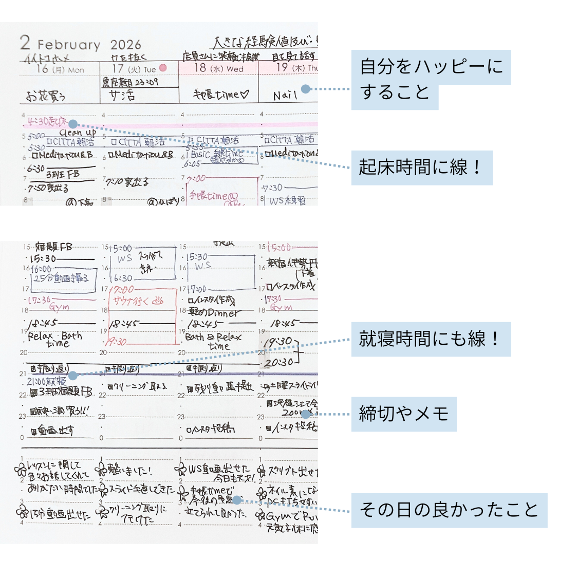 就寝線の下は二分割にしていて、上段には締切や忘れてはいけないこと、下段にはその日の良かったことを書いています。